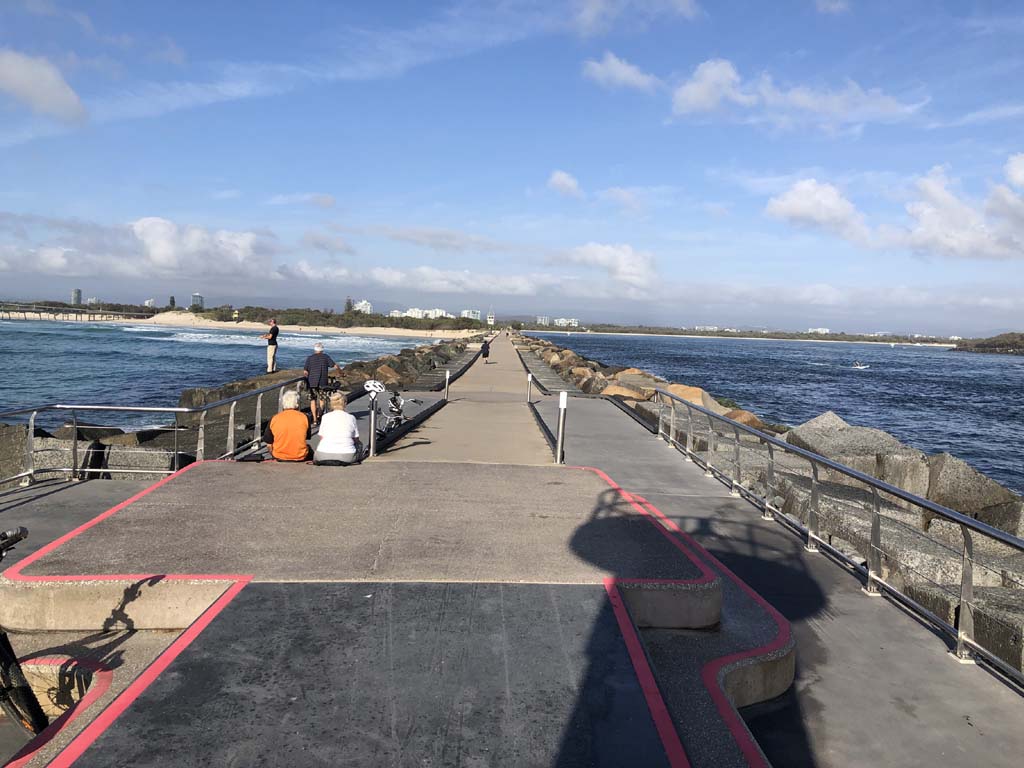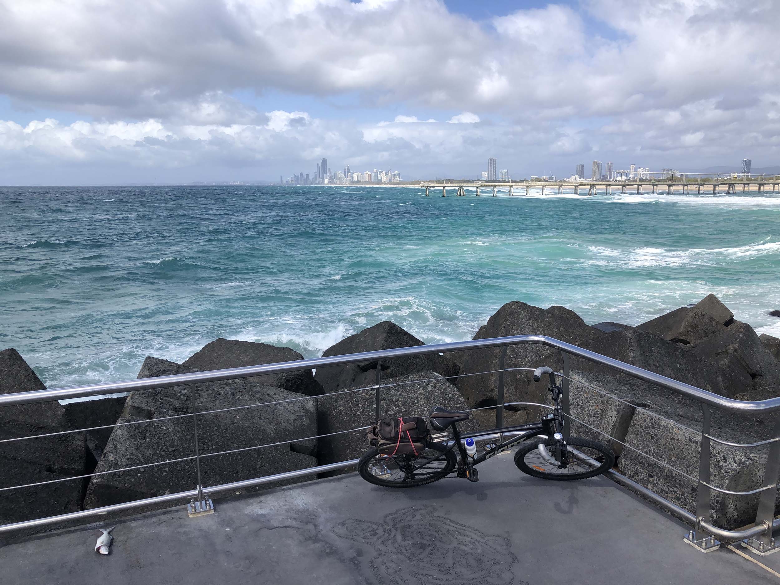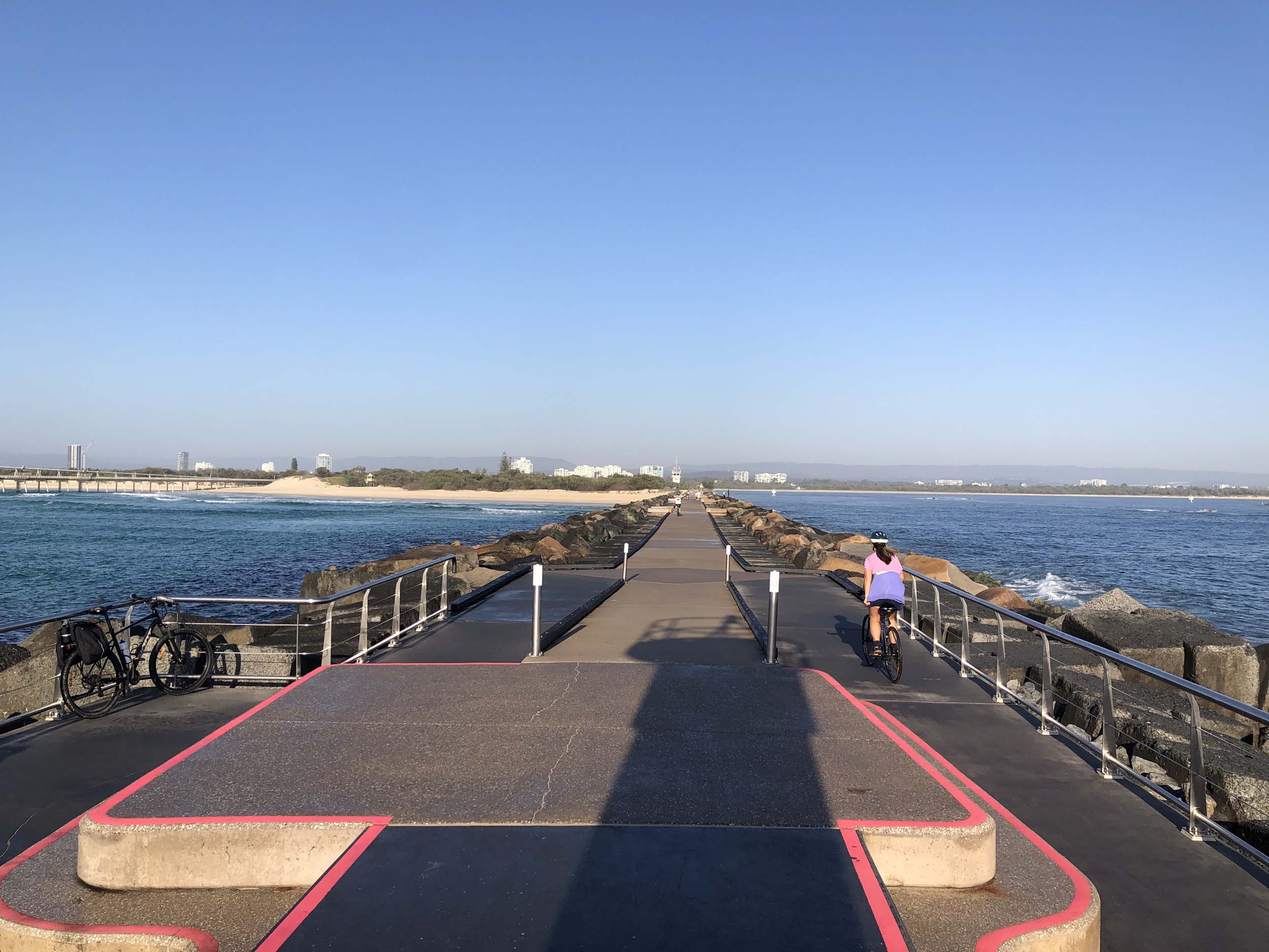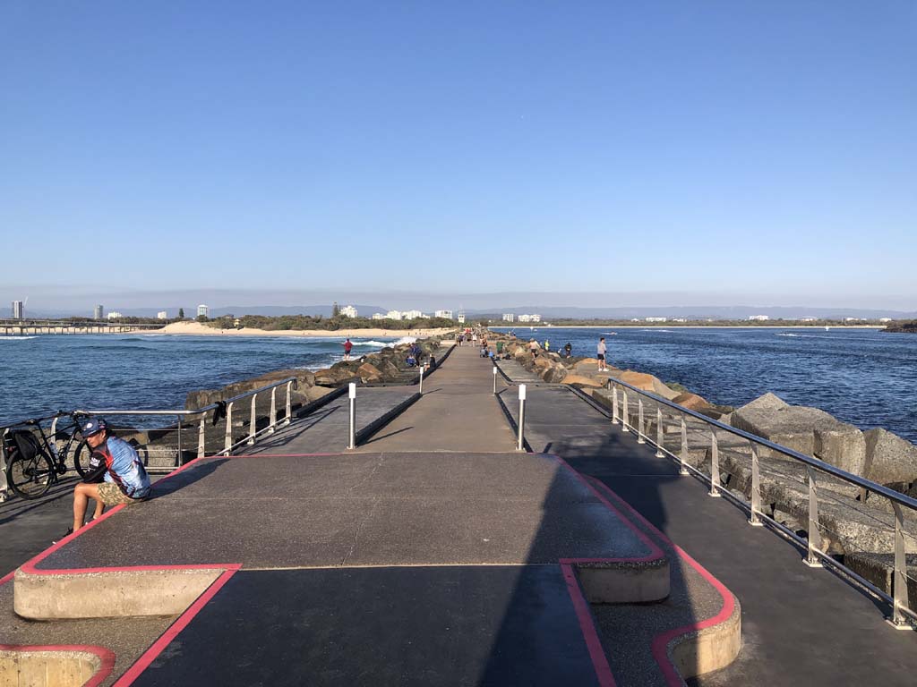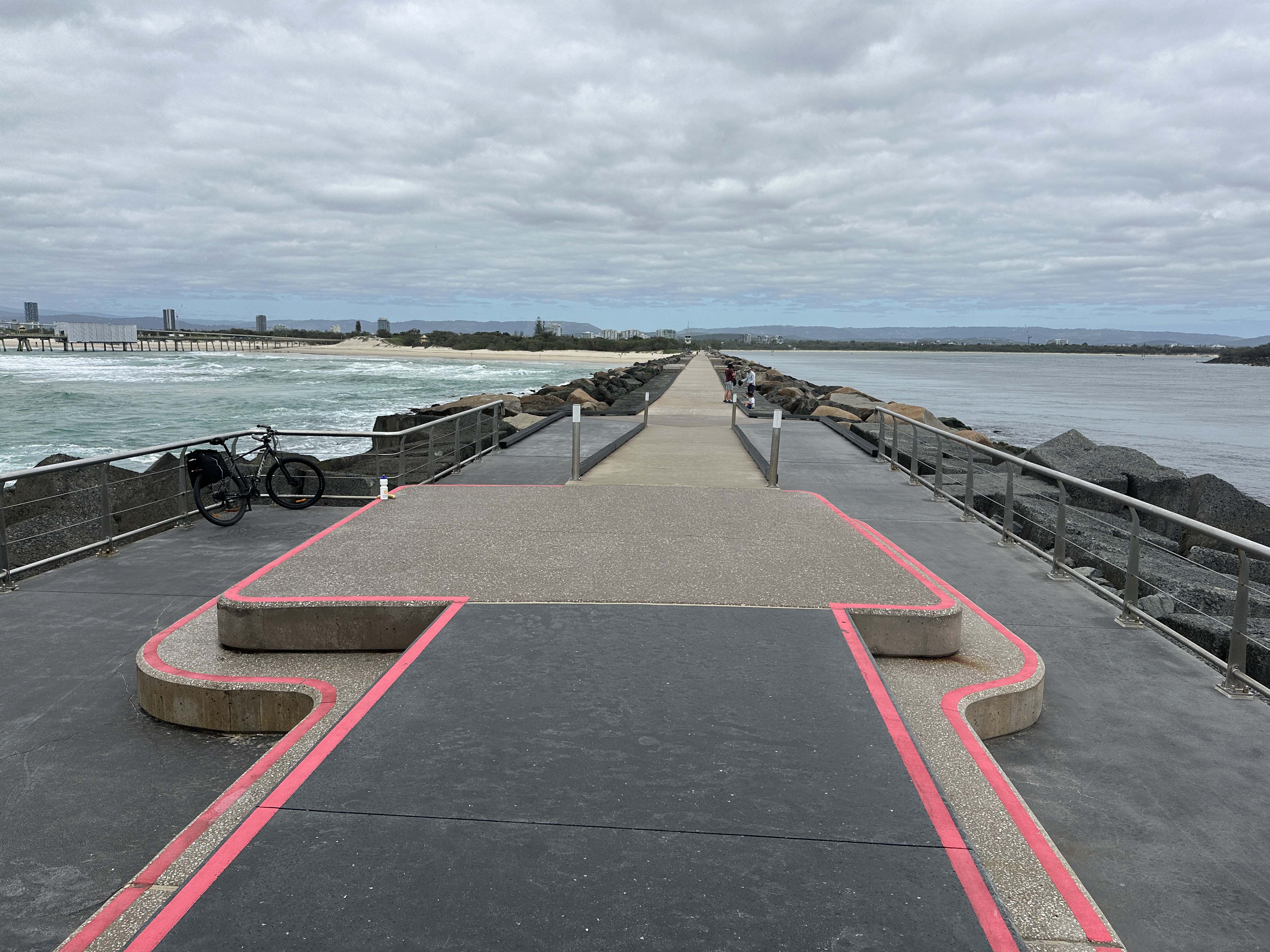 Over the Bridge at Narrowneck then along the Shared Path, towards The Seaway/Spit, via the jetties of Marina Mirage, a lap of the Seaworld Carpark, a lap of the Muriel Henchman carpark and finally made it to the tip of the Seawall/Spit. Stopped and took my photos and ate my banana, then rode to the tip of the Moondarewa Spit, took more photos.