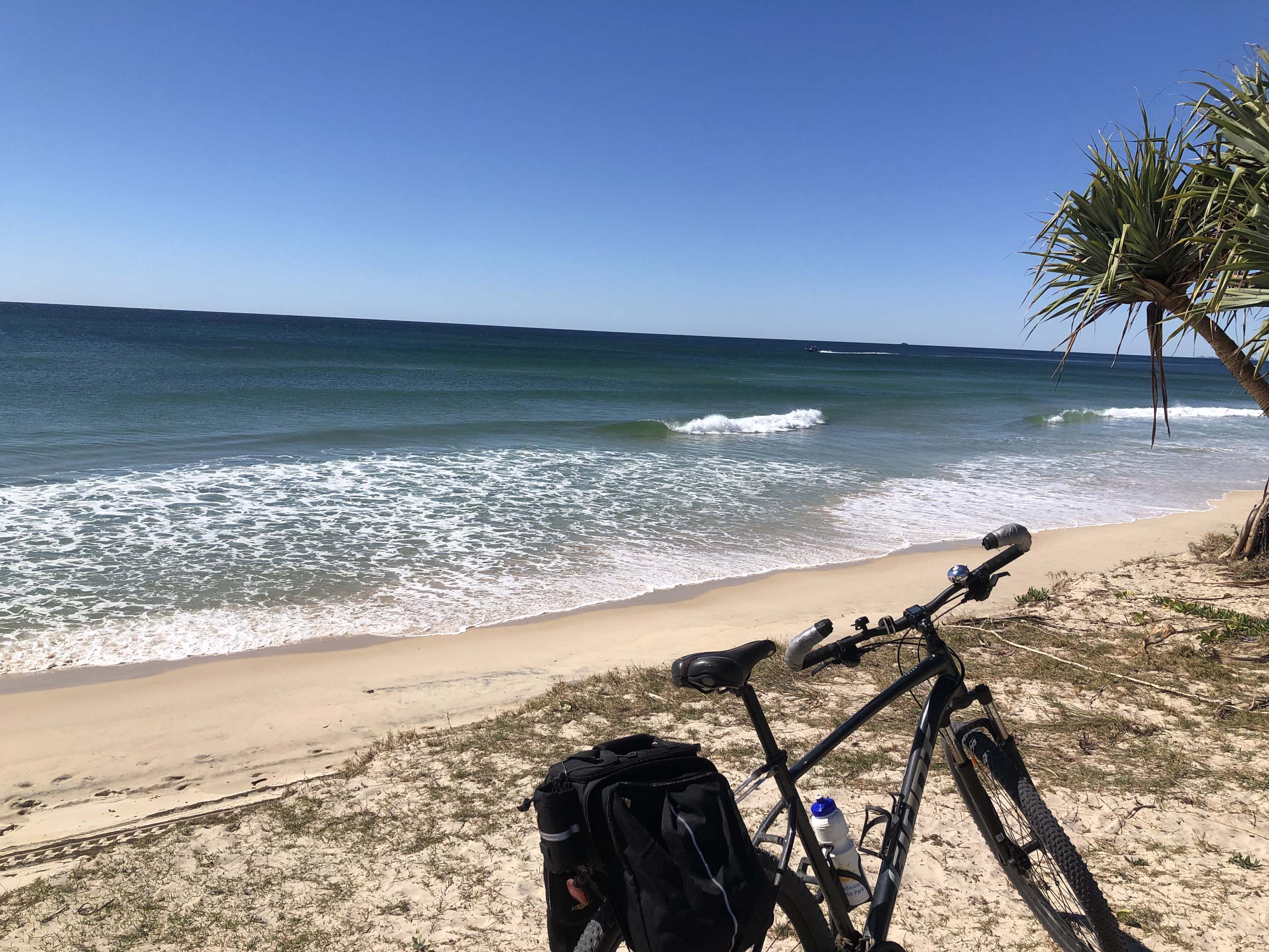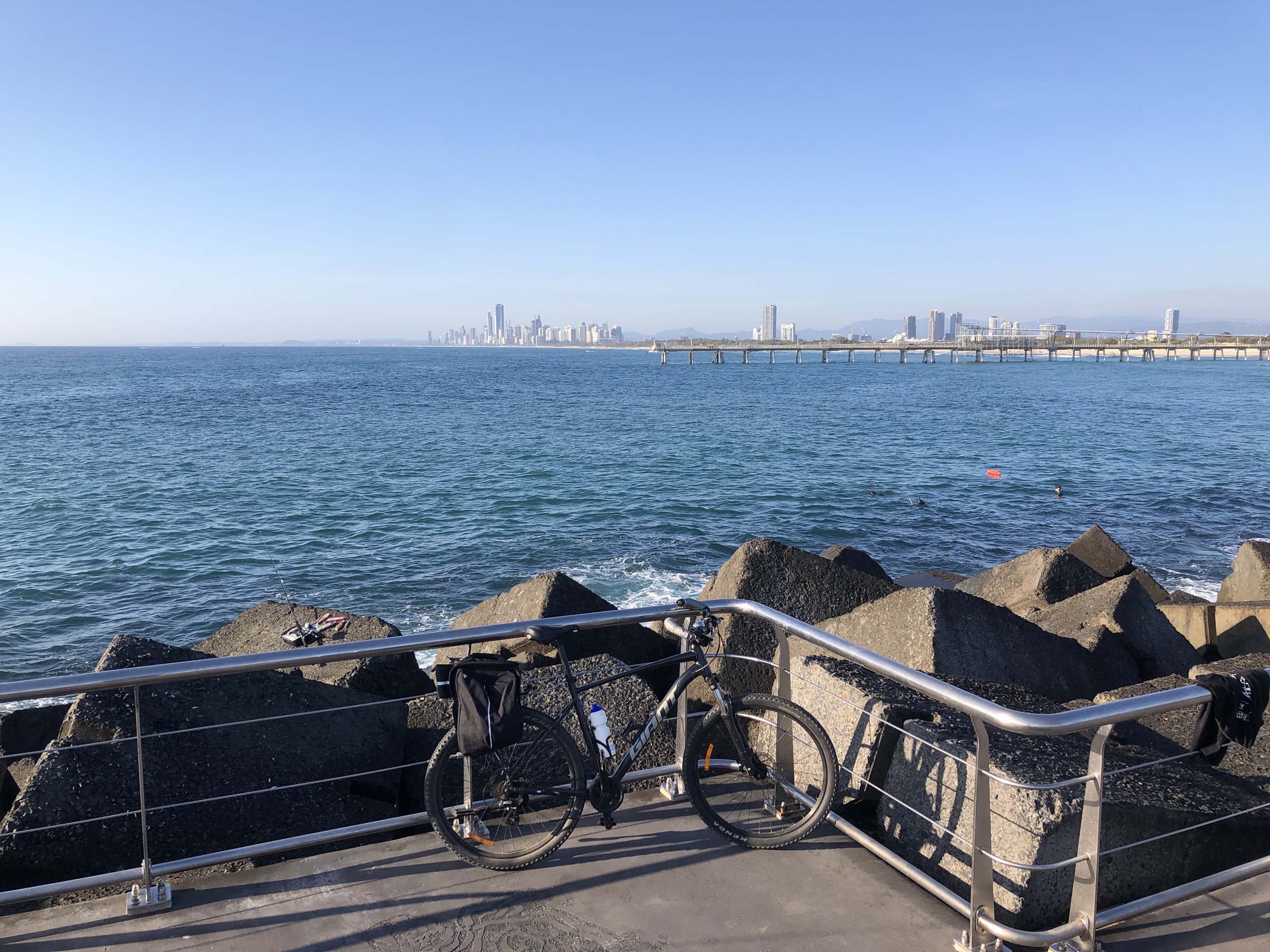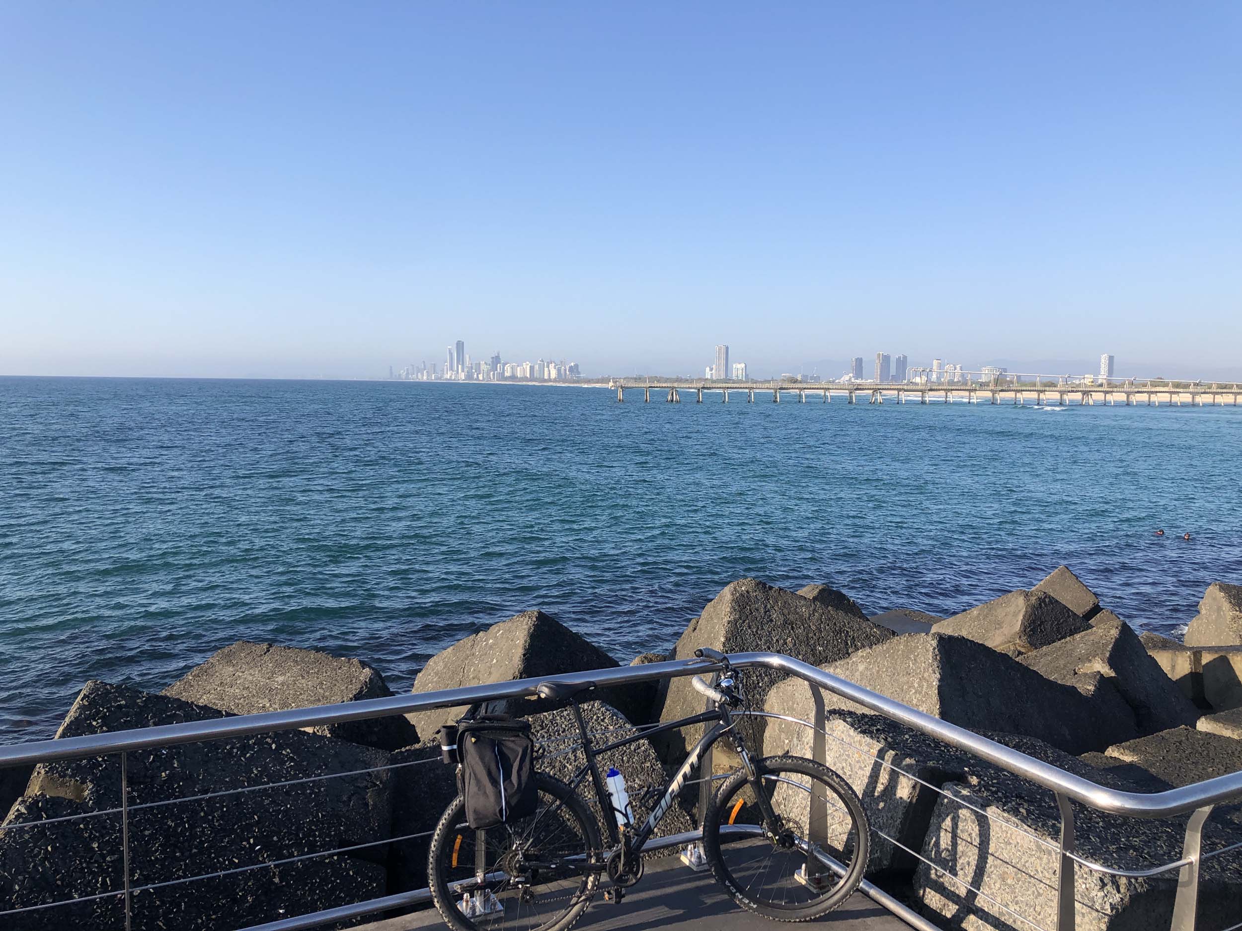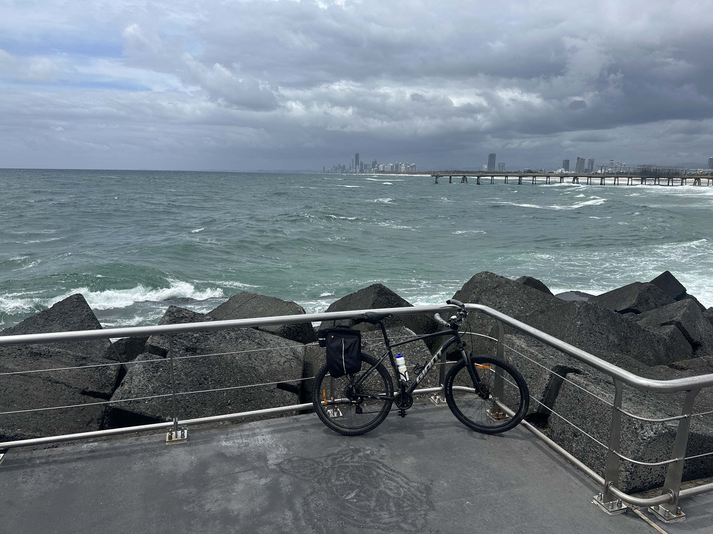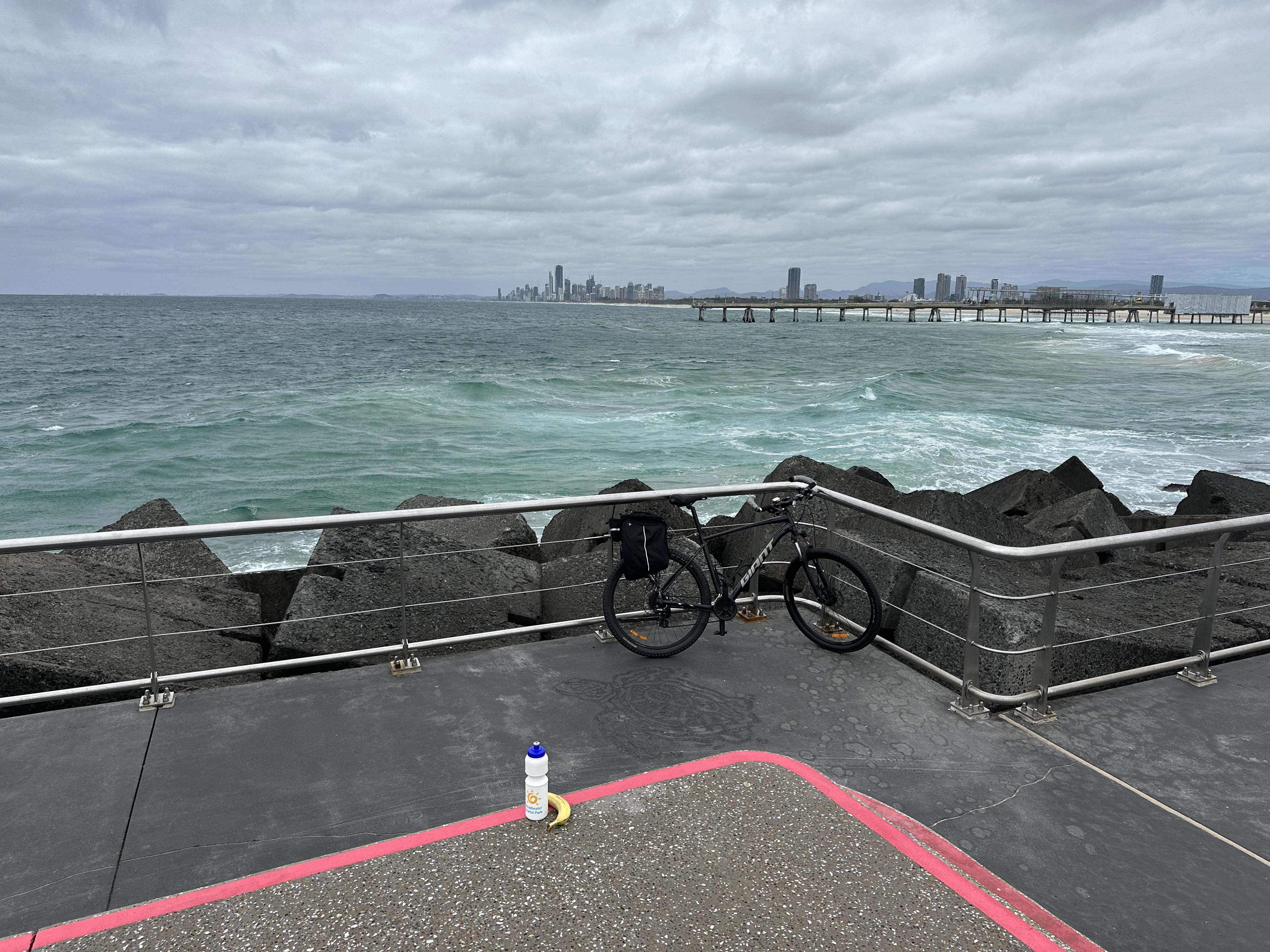 Home to Turnaround Pt down to Surfers via GC600 Park to Surfers to The Spit (both ends - twice) then back through GC600 Park back to Cafe Rockpool and finally back Home about 50+kms.