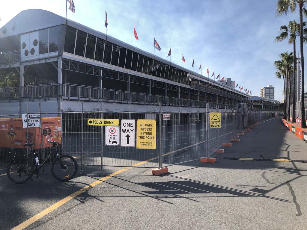 I arrived at the track, various roads had been barricaded to allow the workers to setup the track in relative safety. I spoke to various security workers and asked them if I could sneak inside the temporary fencing to take some photos. "No" was their answer. So I took my photos from outside the temporary fencing and took my photos.