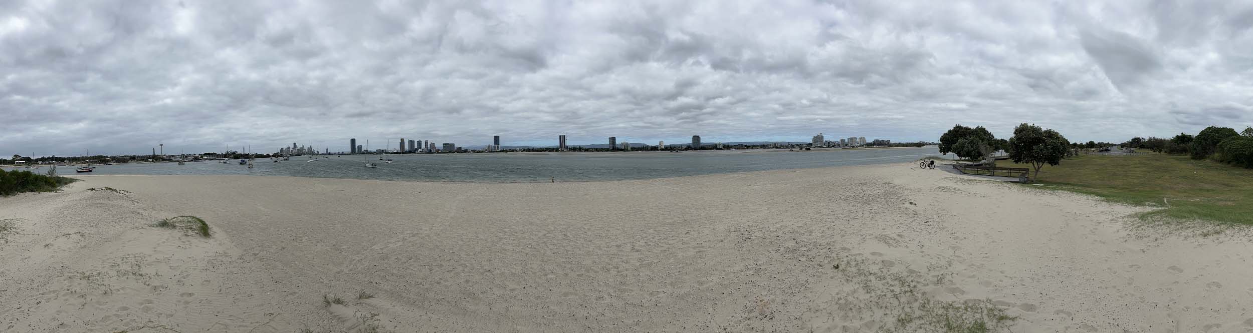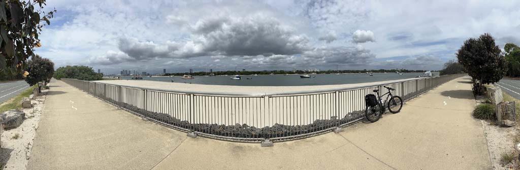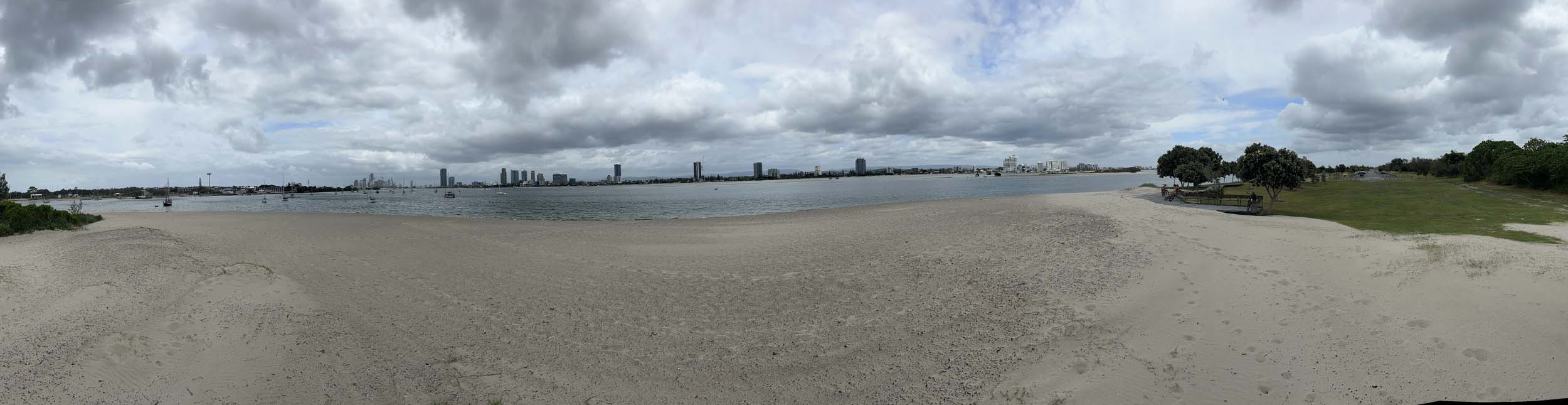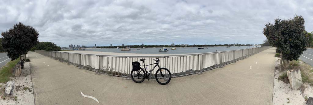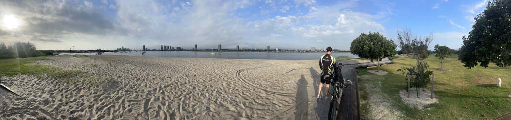 Over the Bridge and through the Southport YC then along the Shared Path, towards The Seaway/Spit, via the jetties of Marina Mirage, a lap of the Seaworld Carpark. Through the Muriel Henchman carpark, rode to the tip of the Moondarewa Spit, took more photos then finally made it to the tip of the Seawall/Spit. Stopped and took my photos and ate my banana. I have a new camera and I couldn't find the Panorama option, I fluked it once.