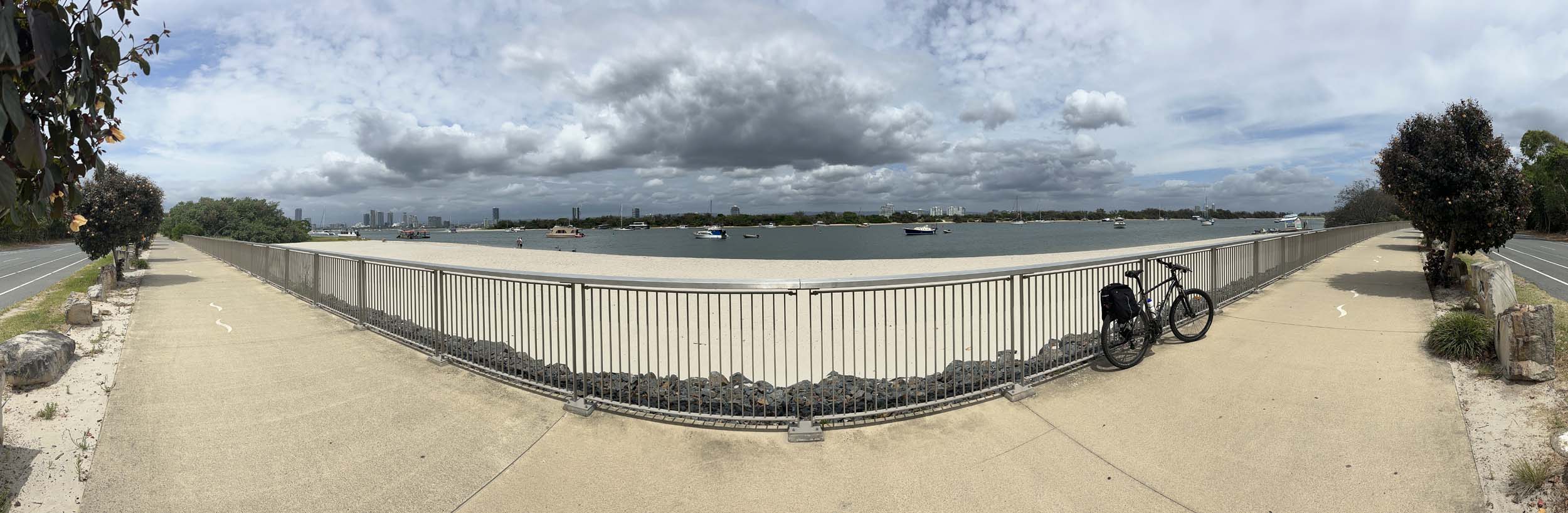I had only ridden 500meters before the scenery got the better of me, I stopped and took photos of Susie Lou. Continued along the shared path over the Loder Ck, past 'our' caravan park, through the Broadwater Parklands, over The Sundale Bridge then past the Superyachts jetty (no superyachts there).