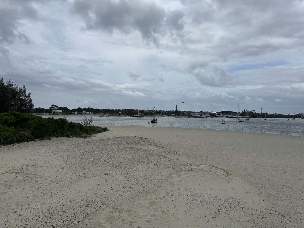 It was overcast with singl rain drops falling. The breeze was a medium Northerly and the Broadwater was calm.
