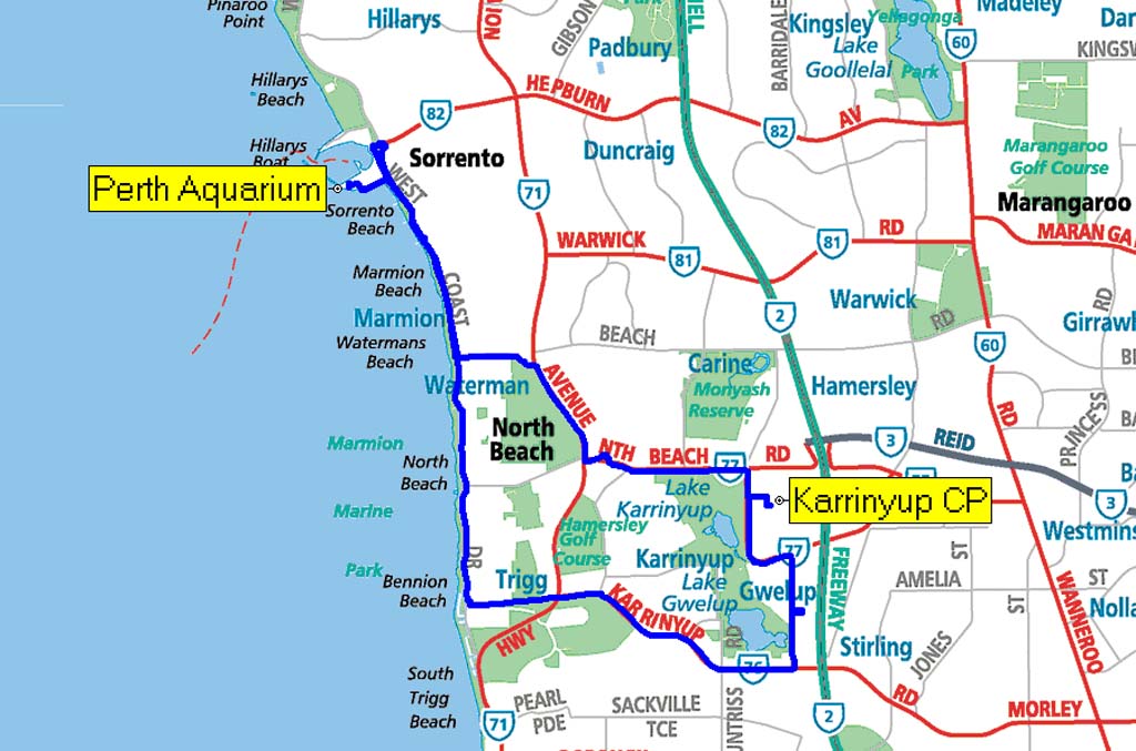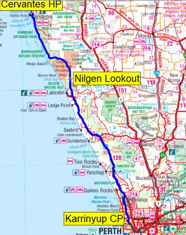 We left Karrinyup Waters Resort at 8:53am and drove the 191kms to The Pinnacles CP, Cervantes. We turned left and headed to Karrinyup Rd, because it was a lot easier to get onto the Mitchell freeway and then headed North and finally got onto Wanneroo Rd, which turns into the Indian Ocean drive.