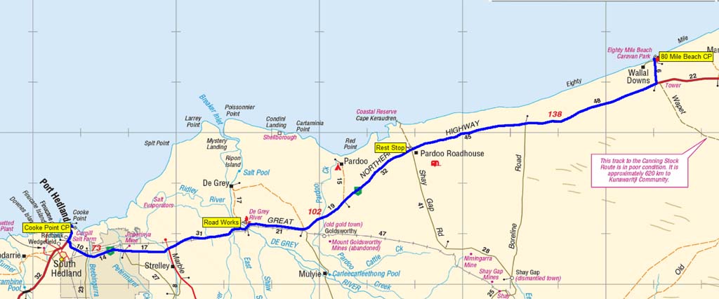 The scenery along the way was beautiful as usual with a few mines dotted here and there, there were 2 gas operations and a couple of quarries. We stopped at Roebourne for fuel and then drove the final 20kms to The Cove CP at Point Samson. This caravan park is one of the better parks that we have stayed at. The park is setup beautifully and each site has a large slab to park your van on and nice dark gravel to park your car and/or awning. I setup the satellite dish on the gravel behind the mighty Navara.